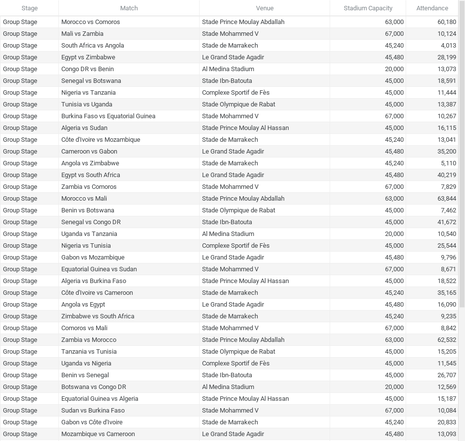 During the group stage, average attendance generally ranged between 10,000 and 15,000 spectators per match, with notable variation across fixtures. Matches involving the host nation recorded the highest turnout. For instance, Morocco vs. Mali at Stade Prince Moulay Abdallah attracted 63,844 spectators, while Morocco vs. Zambia drew 62,532.