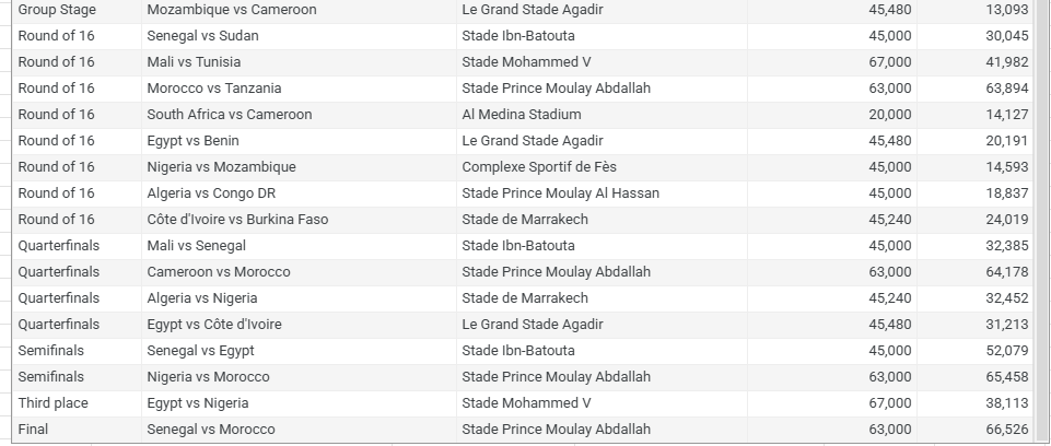 Match attendance at AFCON 2025 followed a clear progression across tournament stages, shaped by team profiles, venue location, and travel logistics. Morocco staged the competition across several large-capacity stadiums, with more than four group-stage venues exceeding 40,000 seats. In such settings, attendance figures that would appear solid in mid-sized stadiums produced the visual impression of sparsely populated stands. By comparison, matches at AFCON 2023 only had one stadium exceeding 40,000 capacity, allowing similar crowd sizes to appear fuller, despite comparable demand.